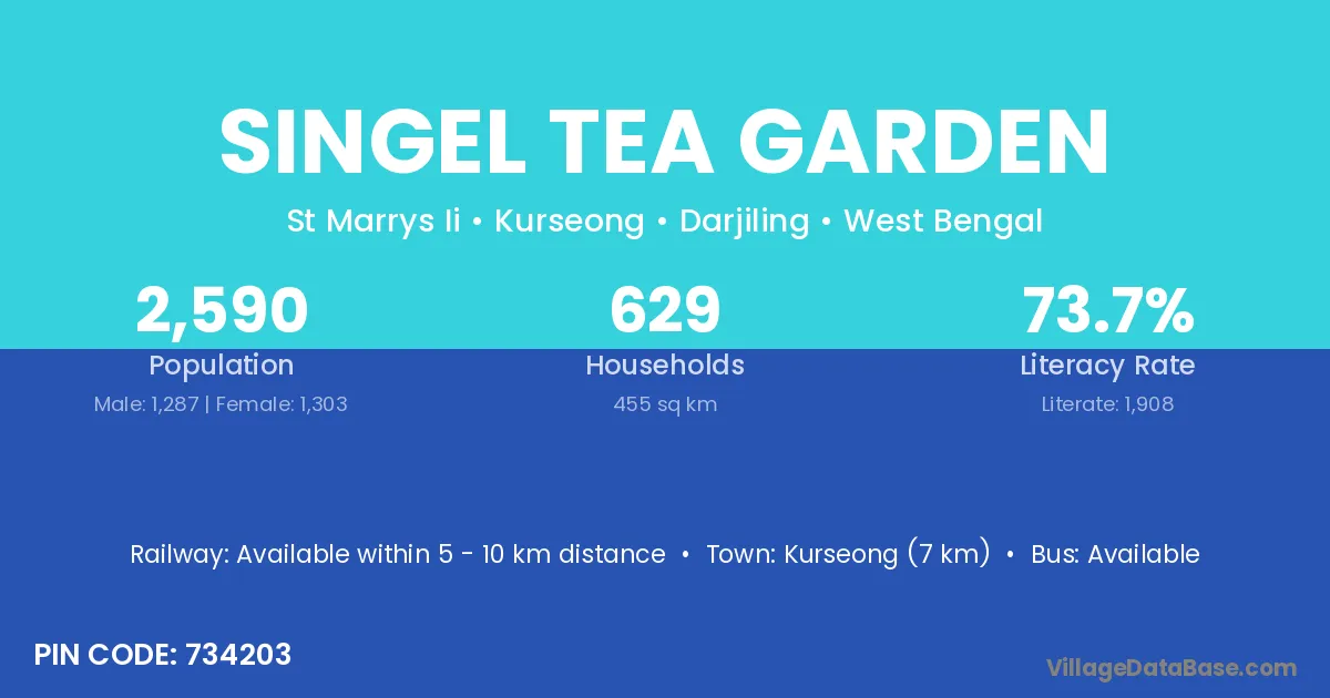 Kurseong (7 km) is the nearest town to Singel Tea Garden village for major economic activities and is located approximately 7 km away.
