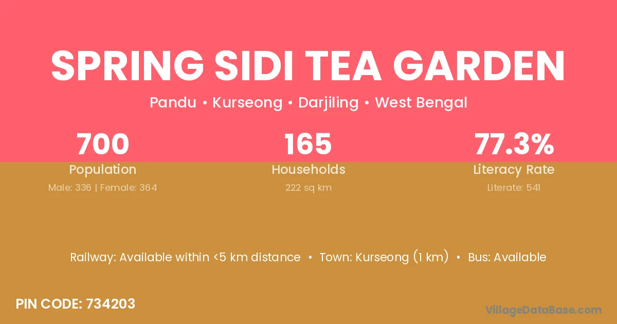 Kurseong (1 km) is the nearest town to Spring Sidi Tea Garden village for major economic activities and is located approximately 1 km away.