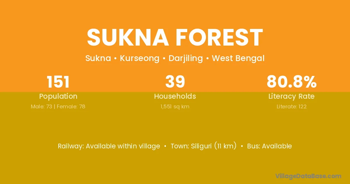 Siliguri (11 km) is the nearest town to Sukna Forest village for major economic activities and is located approximately 11 km away.