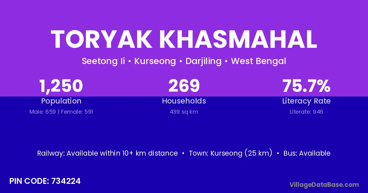 Kurseong (25 km) is the nearest town to Toryak Khasmahal village for major economic activities and is located approximately 25 km away.