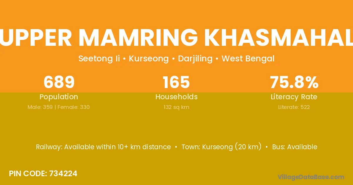 Upper Mamring Khasmahal village has a total population of 689 people, of which 359 are males and 330 are females.