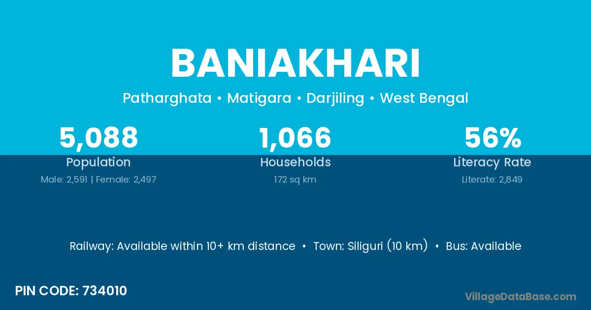 Siliguri (10 km) is the nearest town to Baniakhari village for major economic activities and is located approximately 10 km away.
