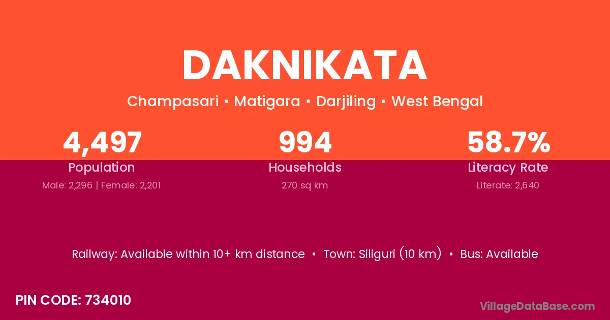 Siliguri (10 km) is the nearest town to Daknikata village for major economic activities and is located approximately 10 km away.