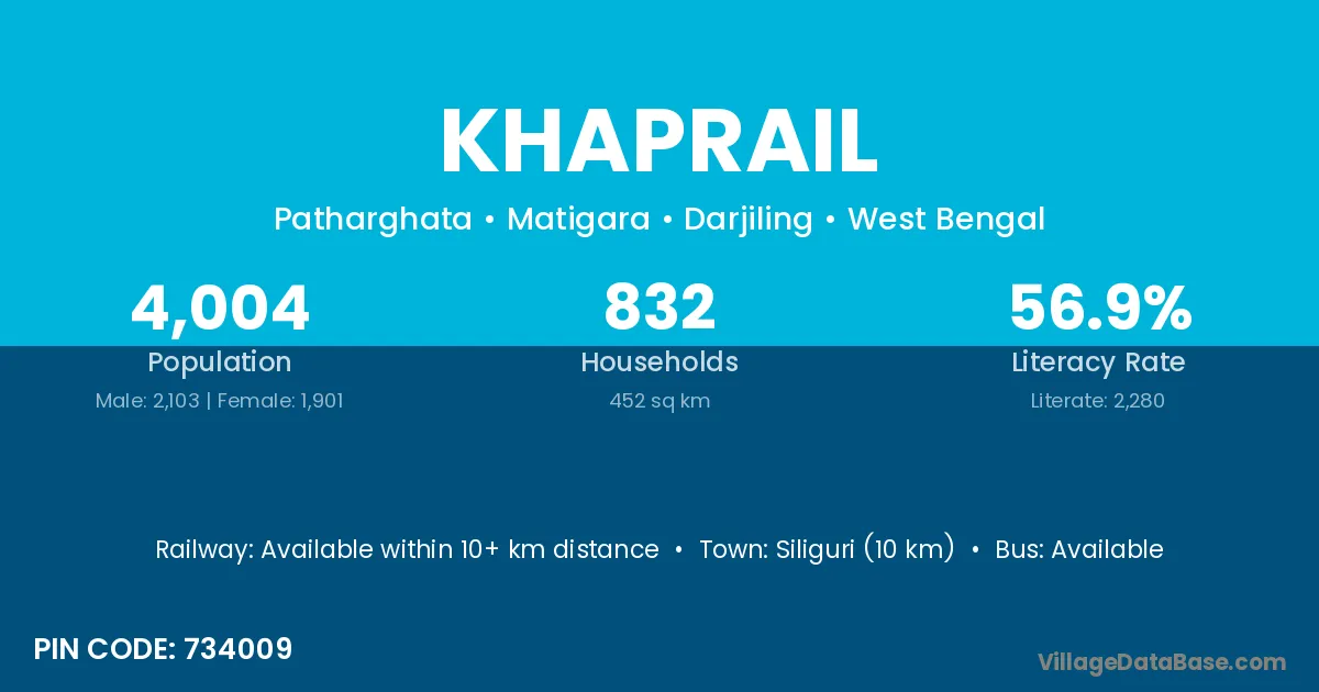 Siliguri (10 km) is the nearest town to Khaprail village for major economic activities and is located approximately 10 km away.