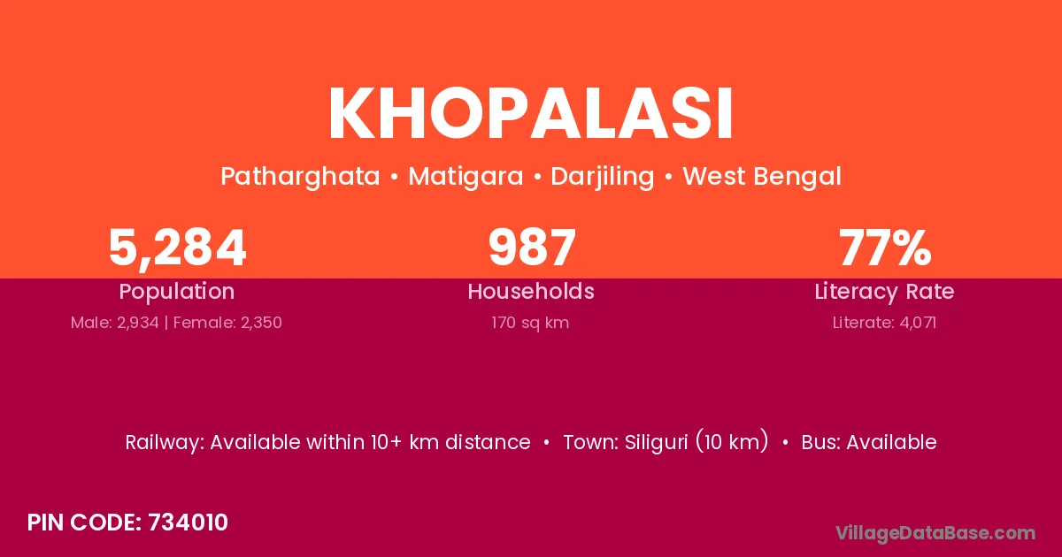 Siliguri (10 km) is the nearest town to Khopalasi village for major economic activities and is located approximately 10 km away.