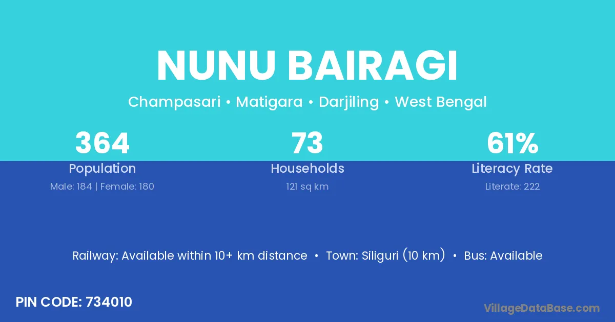 Siliguri (10 km) is the nearest town to Nunu Bairagi village for major economic activities and is located approximately 10 km away.