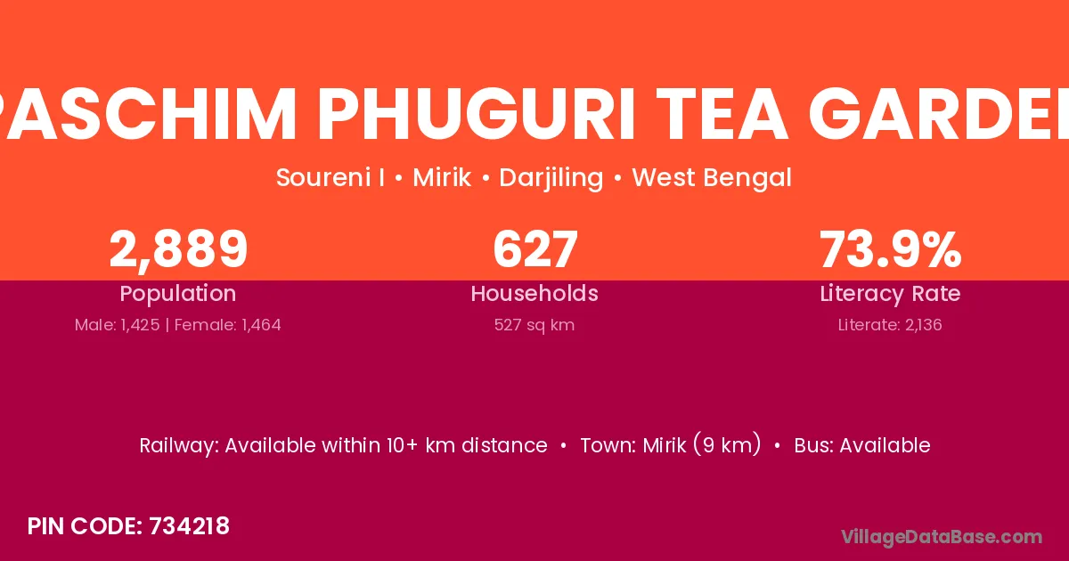 Paschim Phuguri Tea Garden village has a total population of 2,889 people, of which 1,425 are males and 1,464 are females.