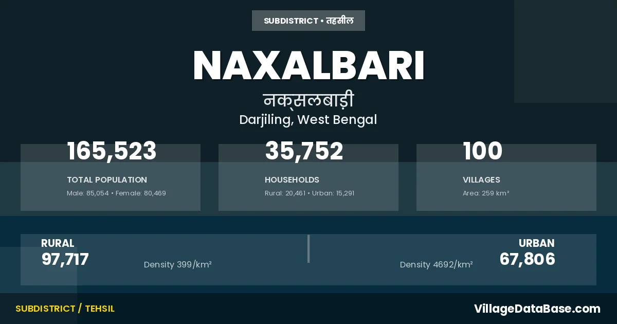 According to the 2011 census The total area of Naxalbari Subdivision is 259 km², with a population of 165523 people. The population density is 638 inhabitants per square kilometre, and there are approximately 35752 houses in the sub district.