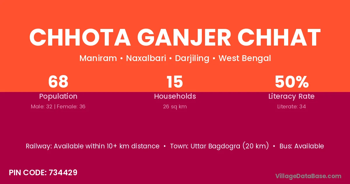 Uttar Bagdogra (20 km) is the nearest town to Chhota Ganjer Chhat village for major economic activities and is located approximately 20 km away.