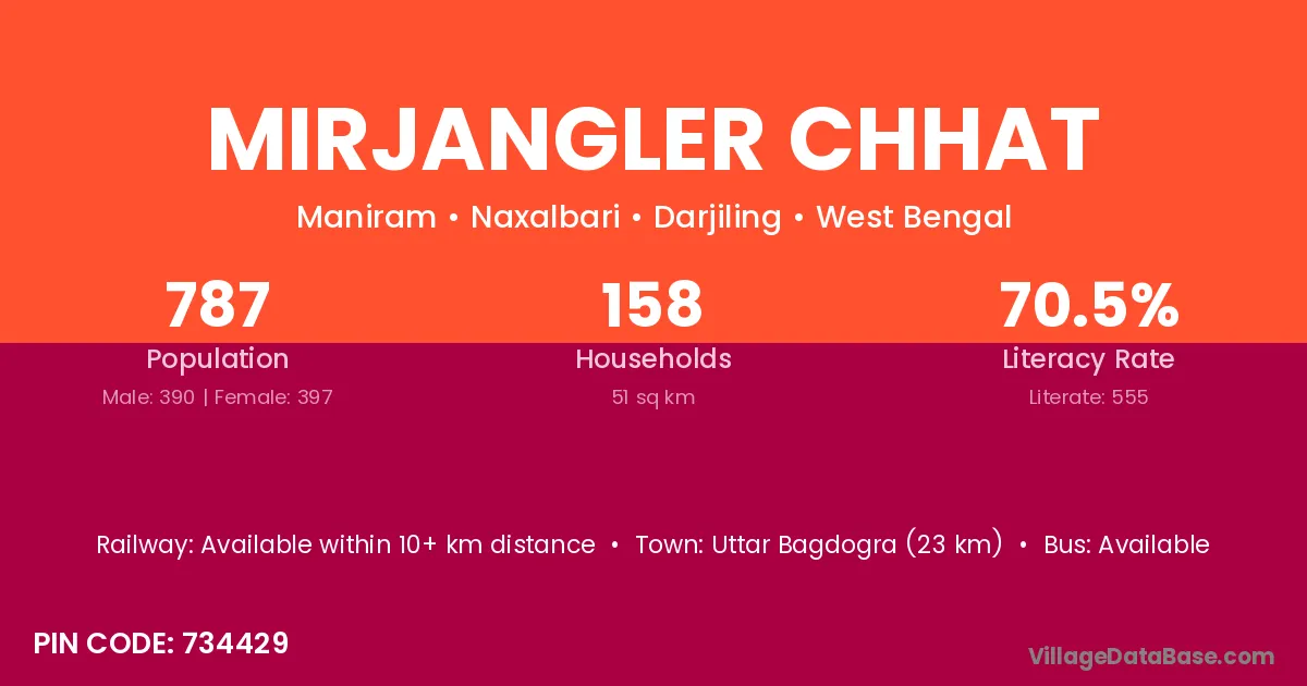 Uttar Bagdogra (23 km) is the nearest town to Mirjangler Chhat village for major economic activities and is located approximately 23 km away.