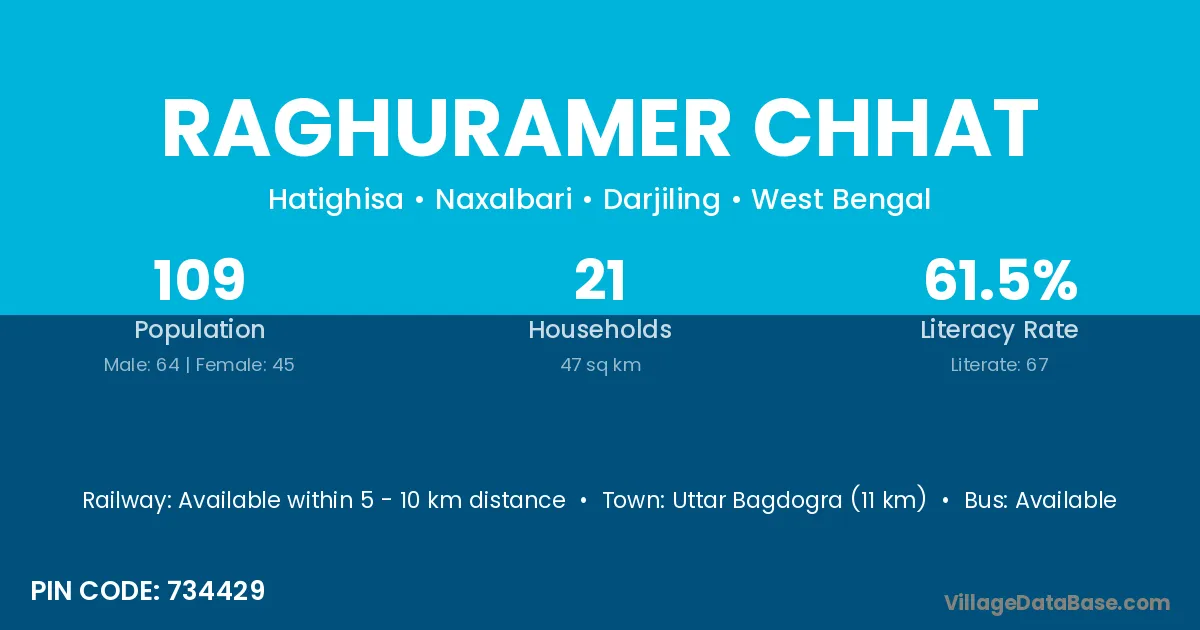 Uttar Bagdogra (11 km) is the nearest town to Raghuramer Chhat village for major economic activities and is located approximately 11 km away.