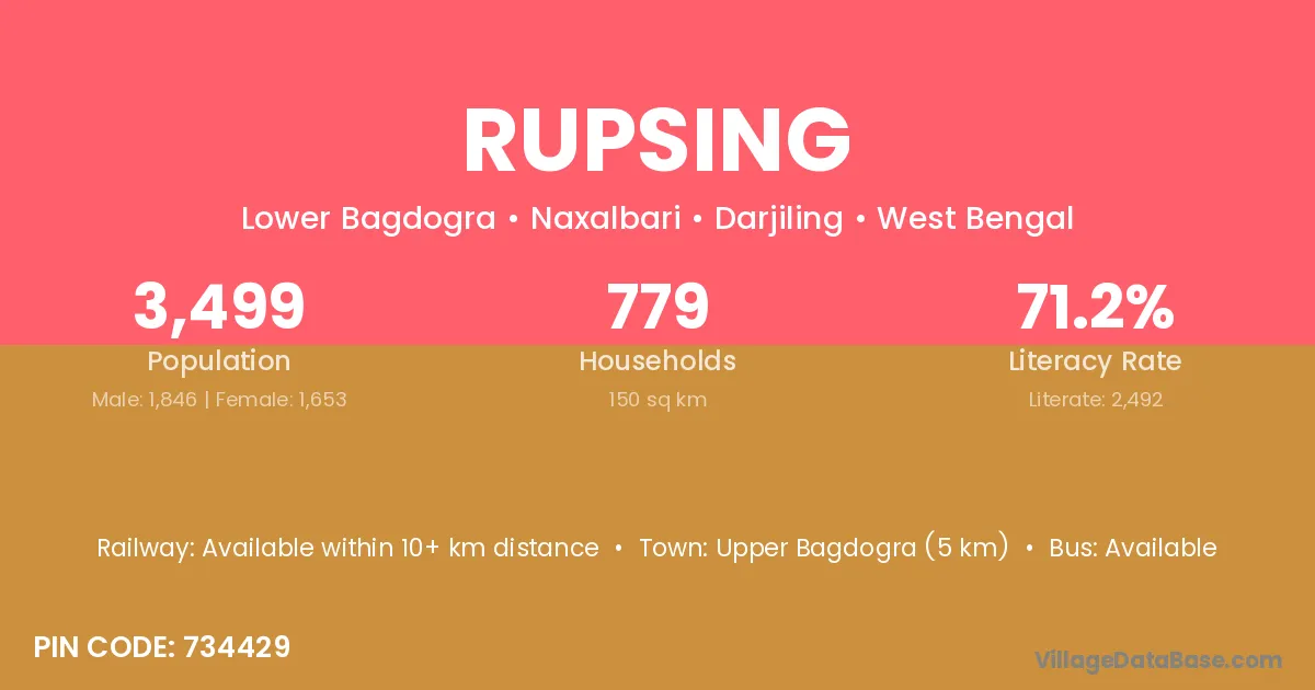 Upper Bagdogra (5 km) is the nearest town to Rupsing village for major economic activities and is located approximately 5 km away.