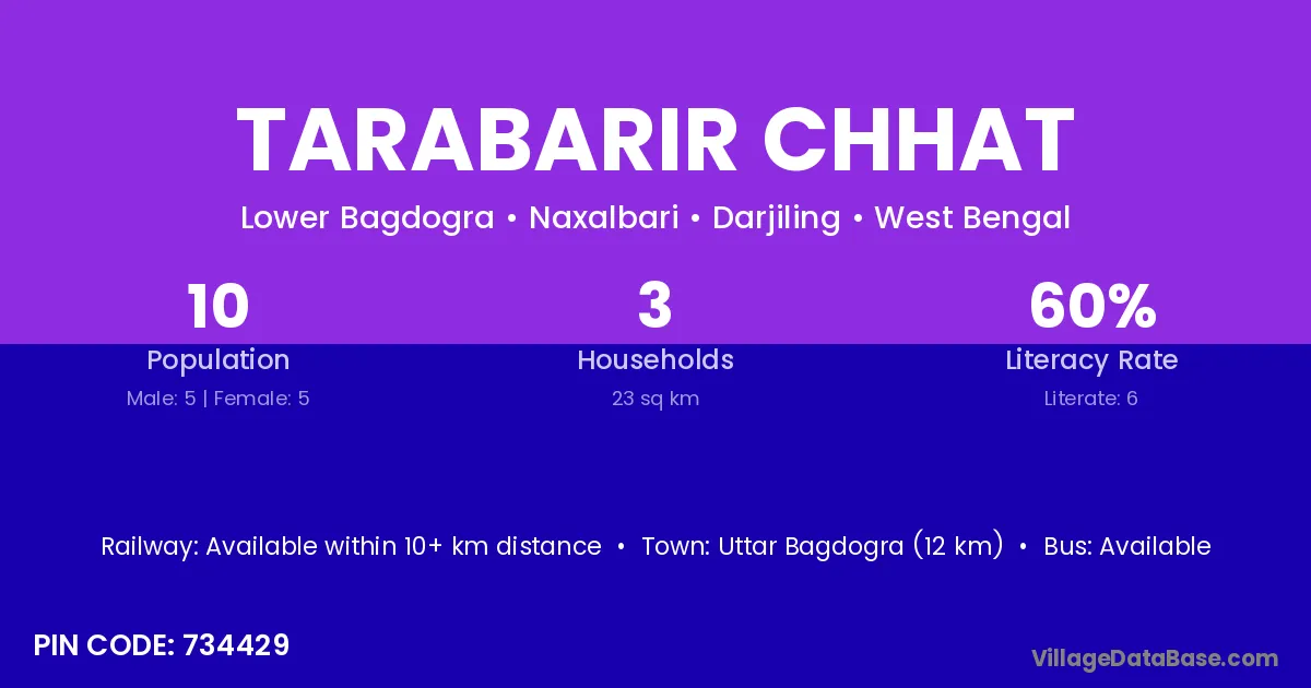 Uttar Bagdogra (12 km) is the nearest town to Tarabarir Chhat village for major economic activities and is located approximately 12 km away.