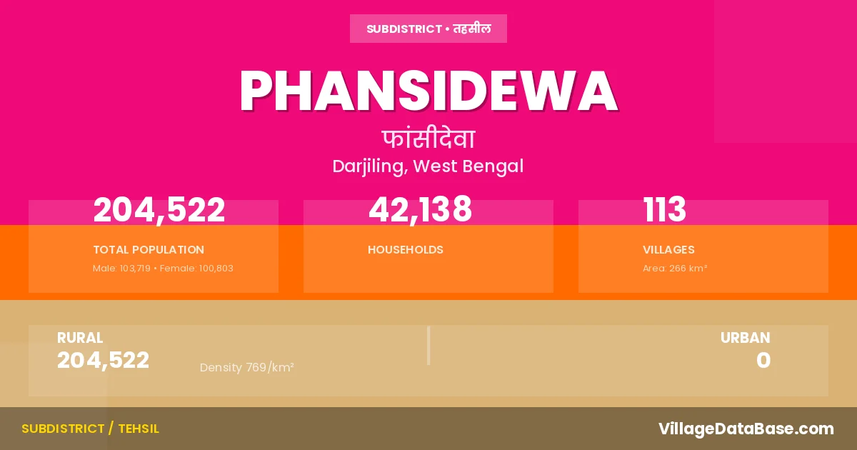 According to the 2011 census The total area of Phansidewa Subdivision is 266 km², with a population of 204522 people. The population density is 769 inhabitants per square kilometre, and there are approximately 42138 houses in the sub district.