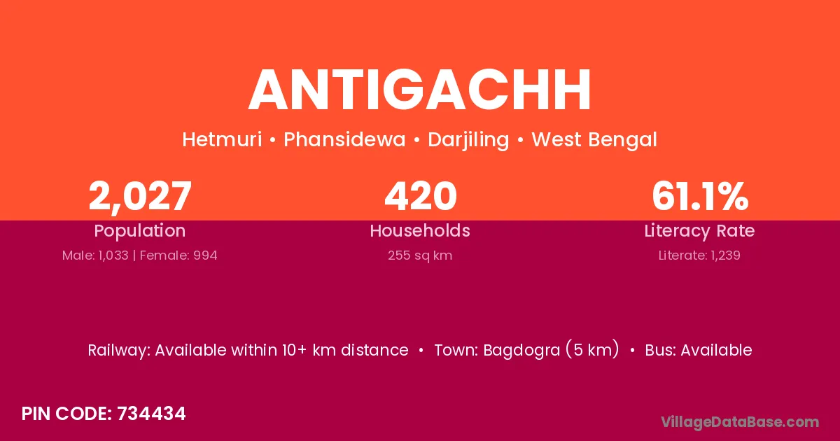 Bagdogra (5 km) is the nearest town to Antigachh village for major economic activities and is located approximately 5 km away.