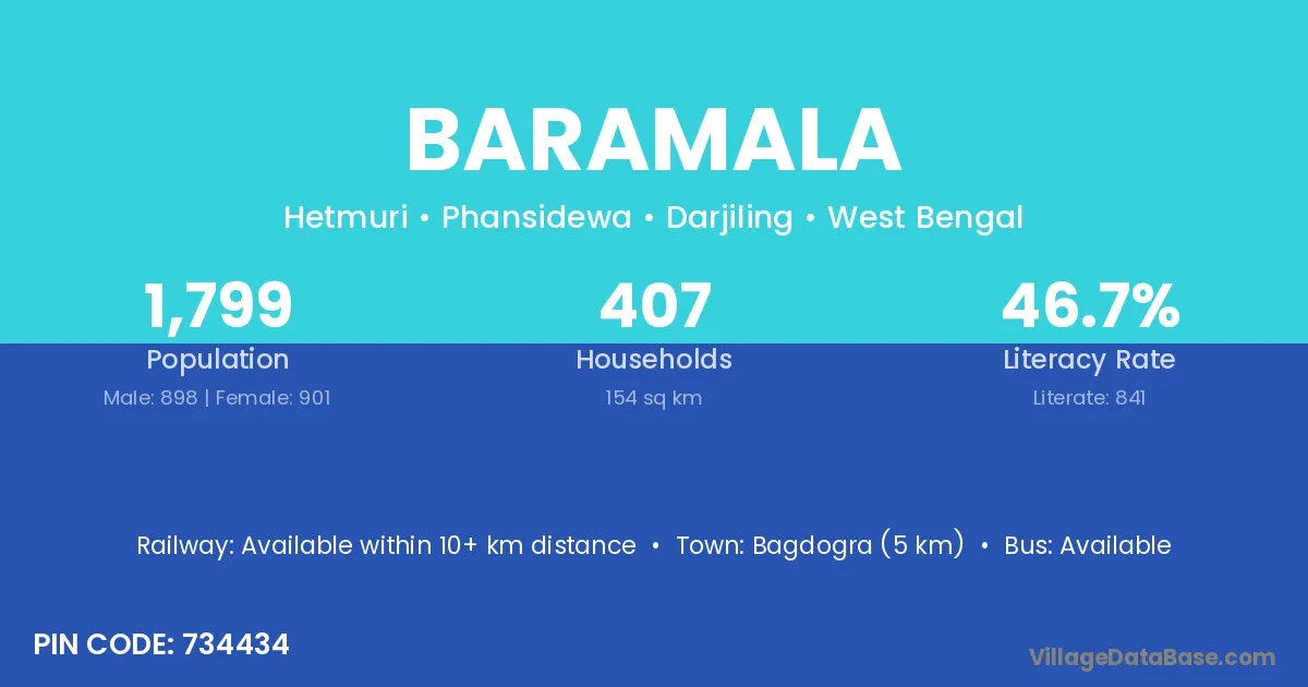 Bagdogra (5 km) is the nearest town to Baramala village for major economic activities and is located approximately 5 km away.