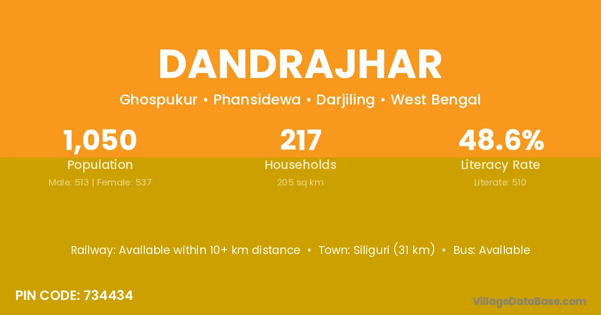 Siliguri (31 km) is the nearest town to Dandrajhar village for major economic activities and is located approximately 31 km away.