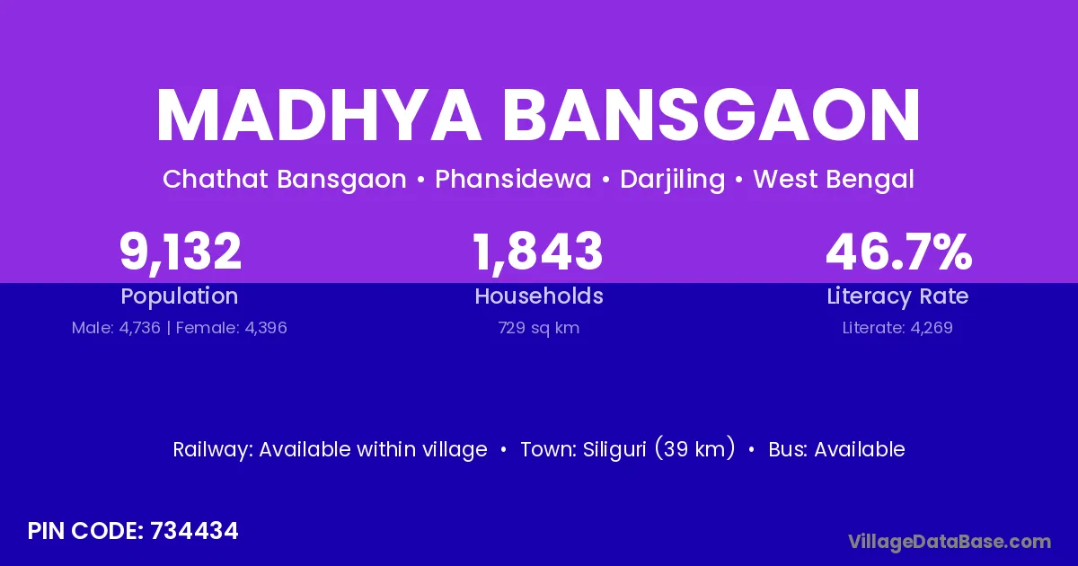 Siliguri (39 km) is the nearest town to Madhya Bansgaon village for major economic activities and is located approximately 39 km away.