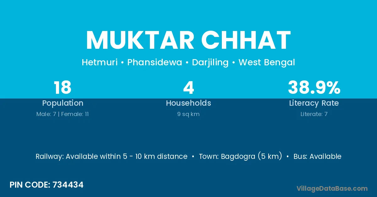 Bagdogra (5 km) is the nearest town to Muktar Chhat village for major economic activities and is located approximately 5 km away.