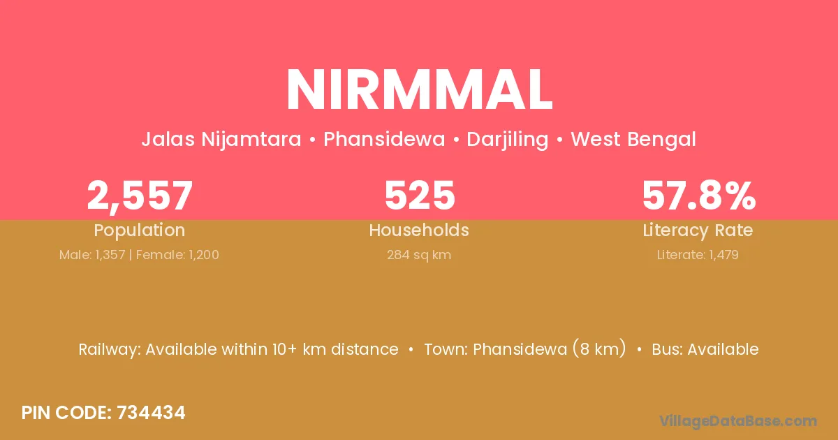 Phansidewa (8 km) is the nearest town to Nirmmal village for major economic activities and is located approximately 8 km away.