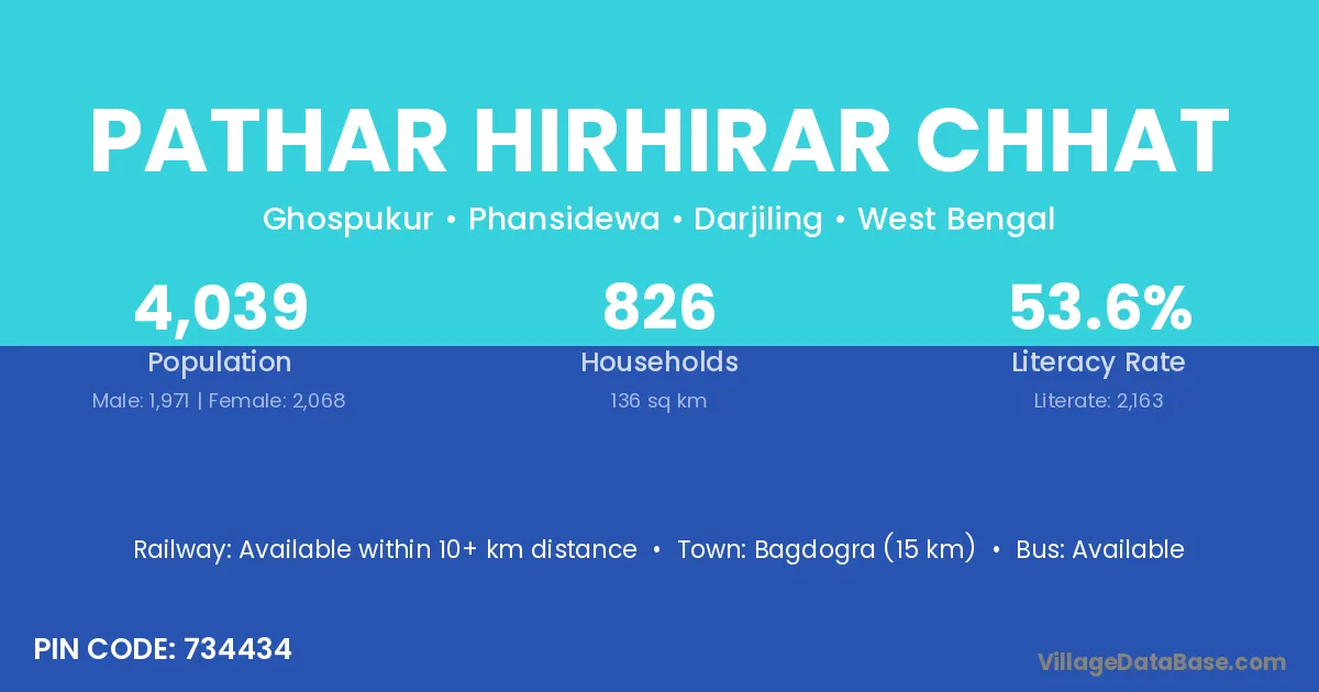 Bagdogra (15 km) is the nearest town to Pathar Hirhirar Chhat village for major economic activities and is located approximately 15 km away.