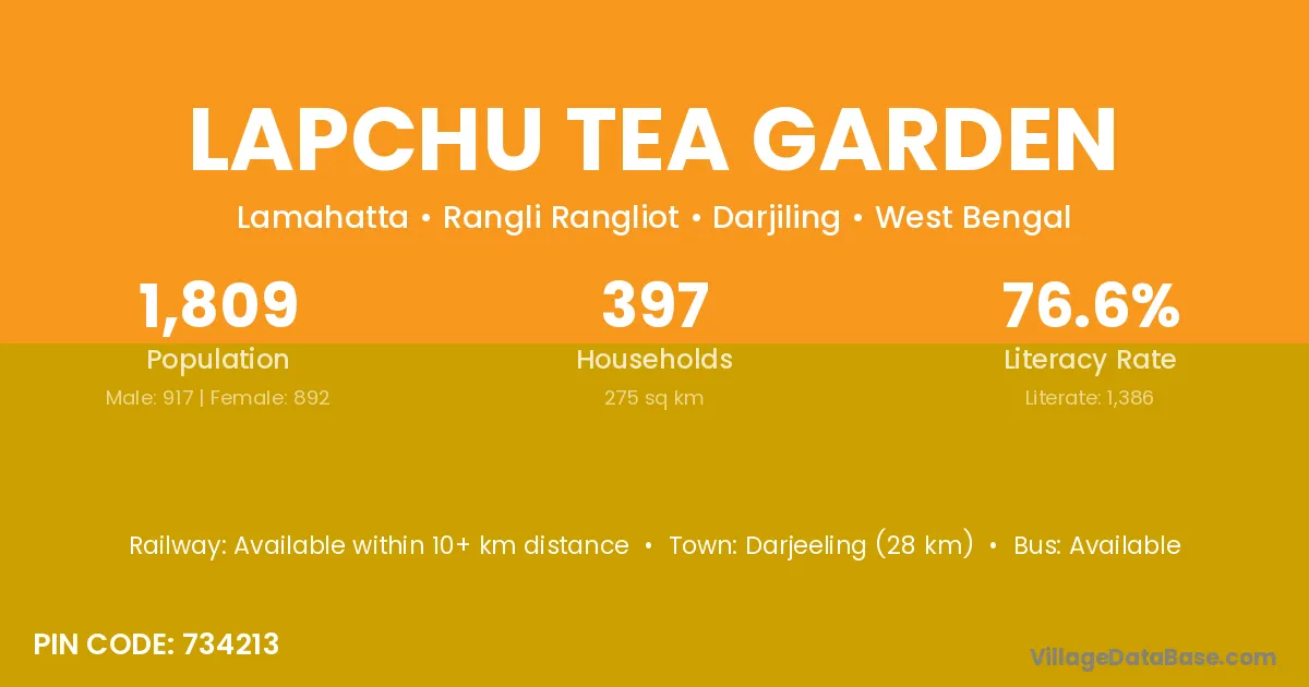 According to Census 2011 information, the village code of Lapchu Tea Garden village is 734213.