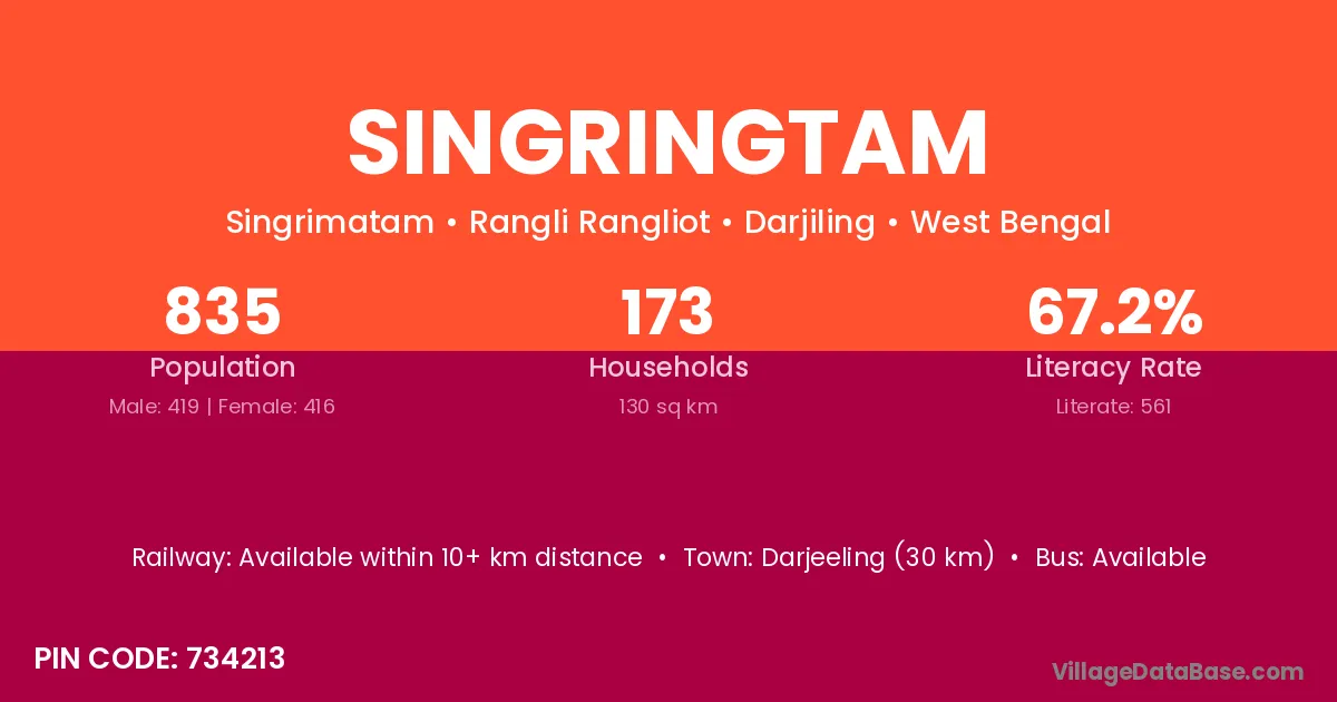 Singringtam village has a total population of 835 people, of which 419 are males and 416 are females.