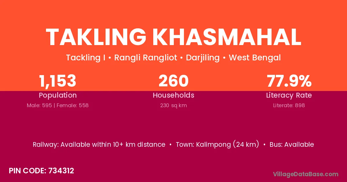 Kalimpong (24 km) is the nearest town to Takling Khasmahal village for major economic activities and is located approximately 24 km away.