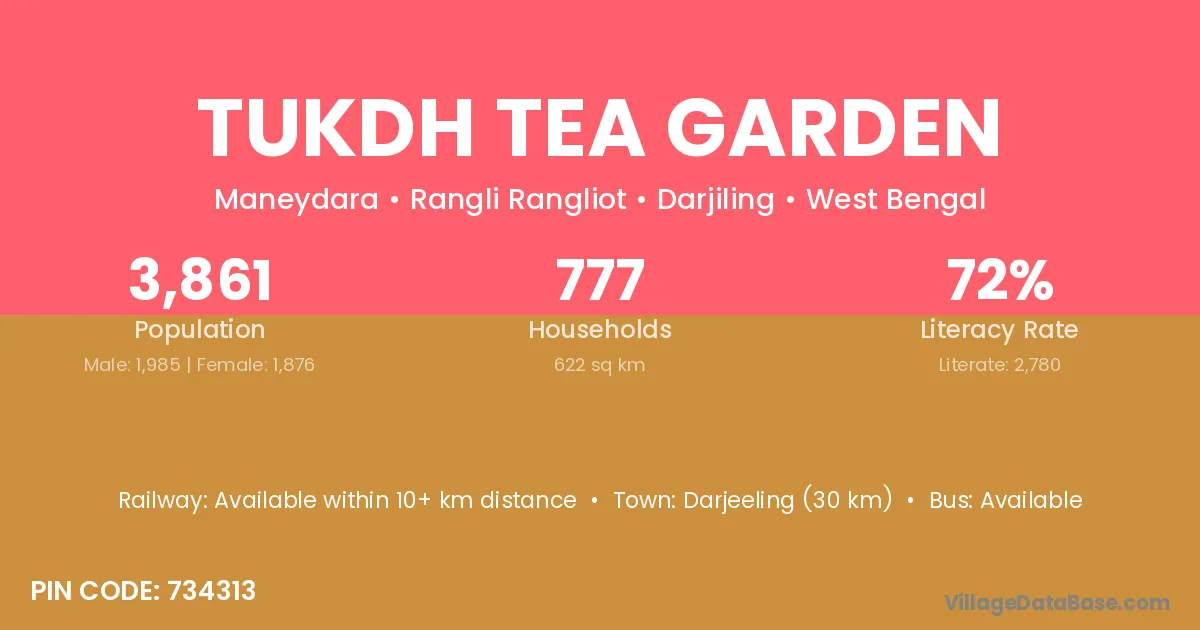 Tukdh Tea Garden village has a total population of 3,861 people, of which 1,985 are males and 1,876 are females.