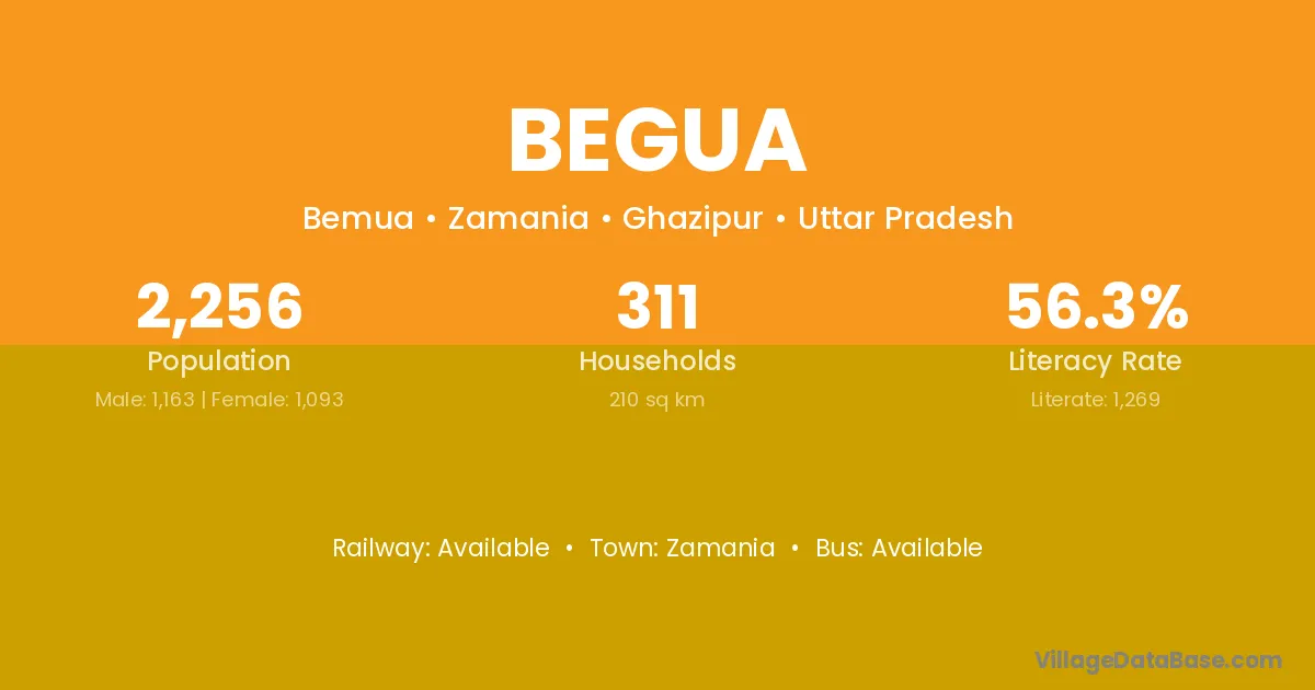 The literacy rate of Begua village is 80.13%. Male literacy stands at 84.60% and female literacy at 75.48%.