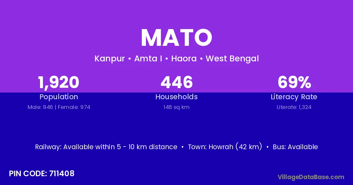 Howrah (42 km) is the nearest town to Mato village for major economic activities and is located approximately 42 km away.