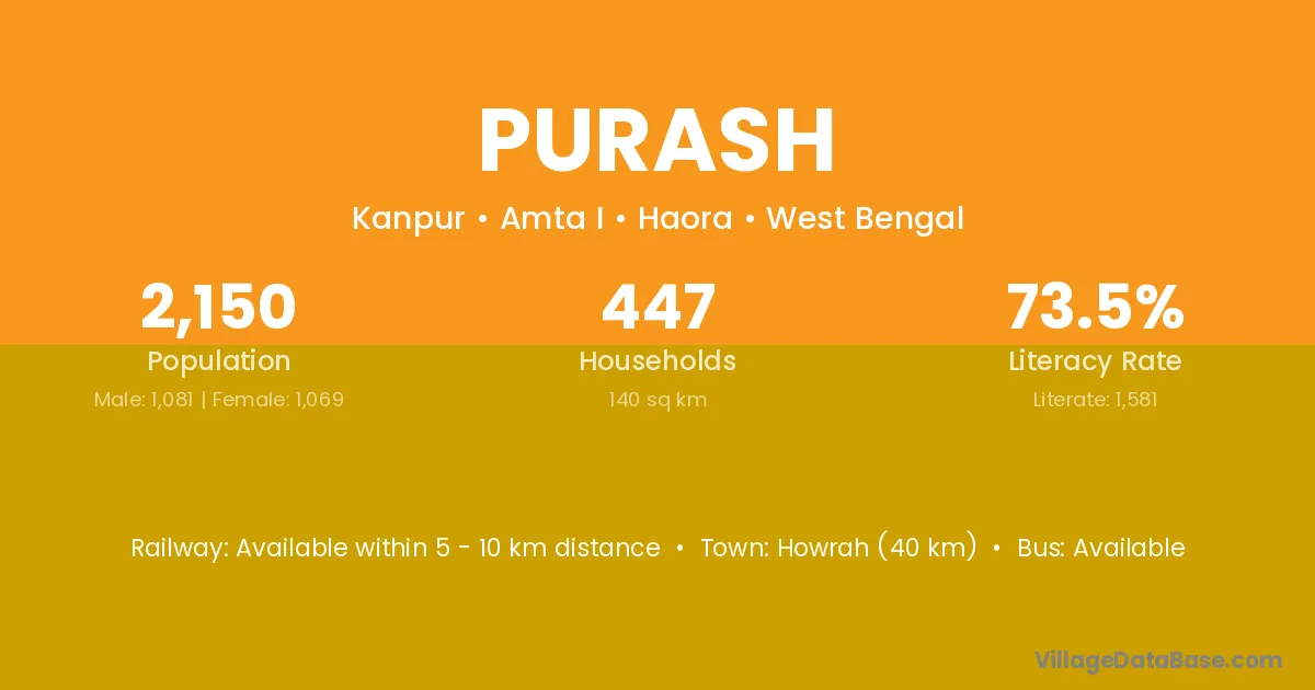 Howrah (40 km) is the nearest town to Purash village for major economic activities and is located approximately 40 km away.