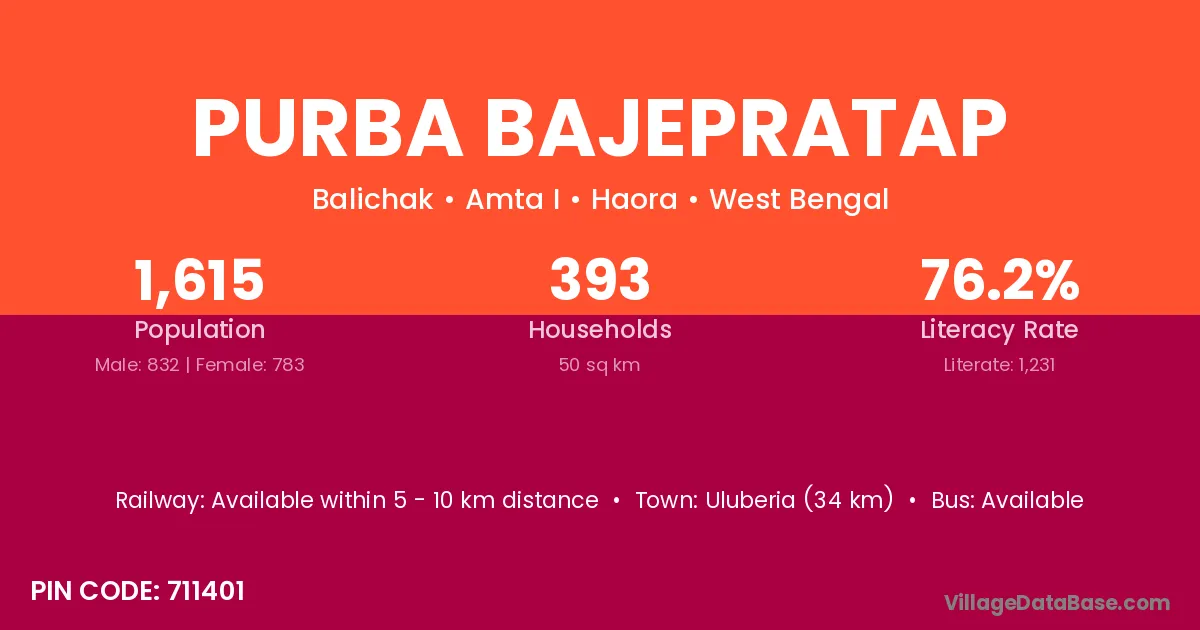 Uluberia (34 km) is the nearest town to Purba Bajepratap village for major economic activities and is located approximately 34 km away.