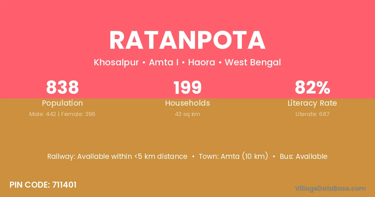 Amta (10 km) is the nearest town to Ratanpota village for major economic activities and is located approximately 10 km away.