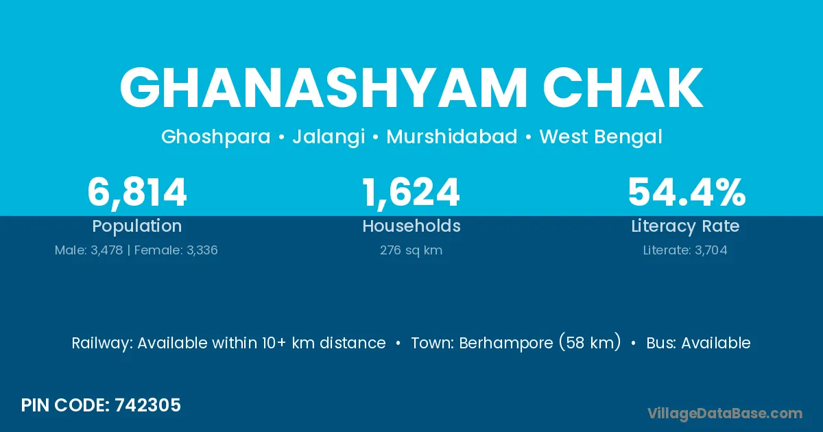 Uluberia (30 km) is the nearest town to Ghanashyam Chak village for major economic activities and is located approximately 30 km away.