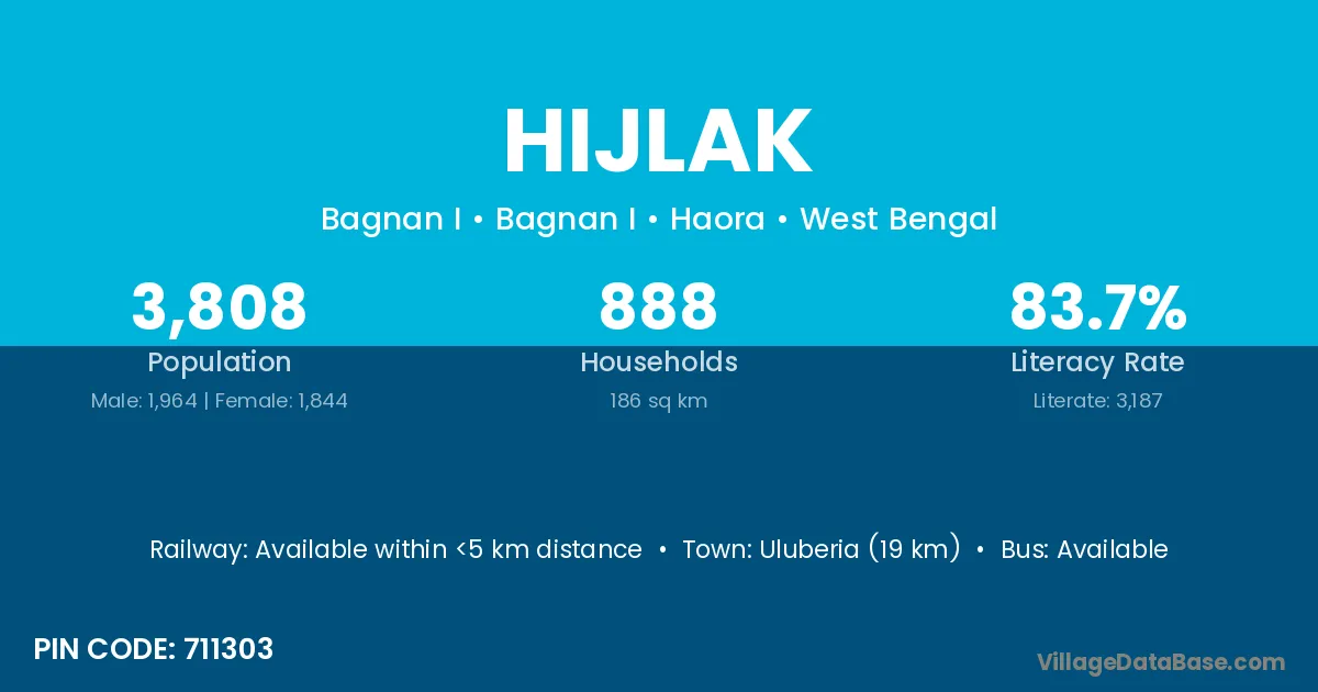 Uluberia (19 km) is the nearest town to Hijlak village for major economic activities and is located approximately 19 km away.