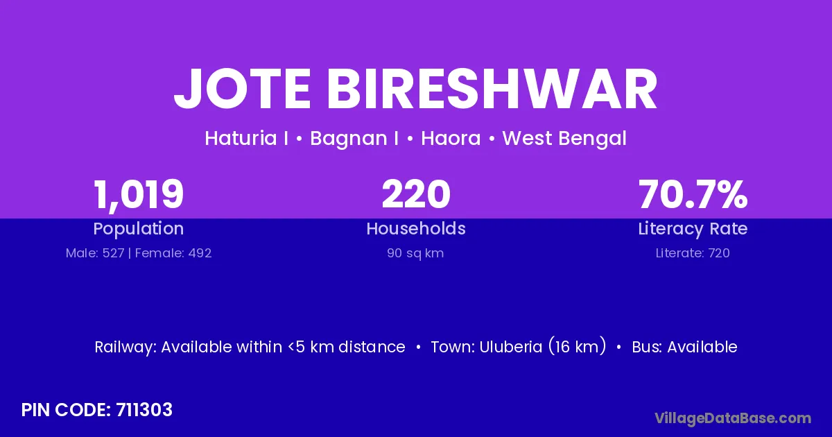 Uluberia (16 km) is the nearest town to Jote Bireshwar village for major economic activities and is located approximately 16 km away.