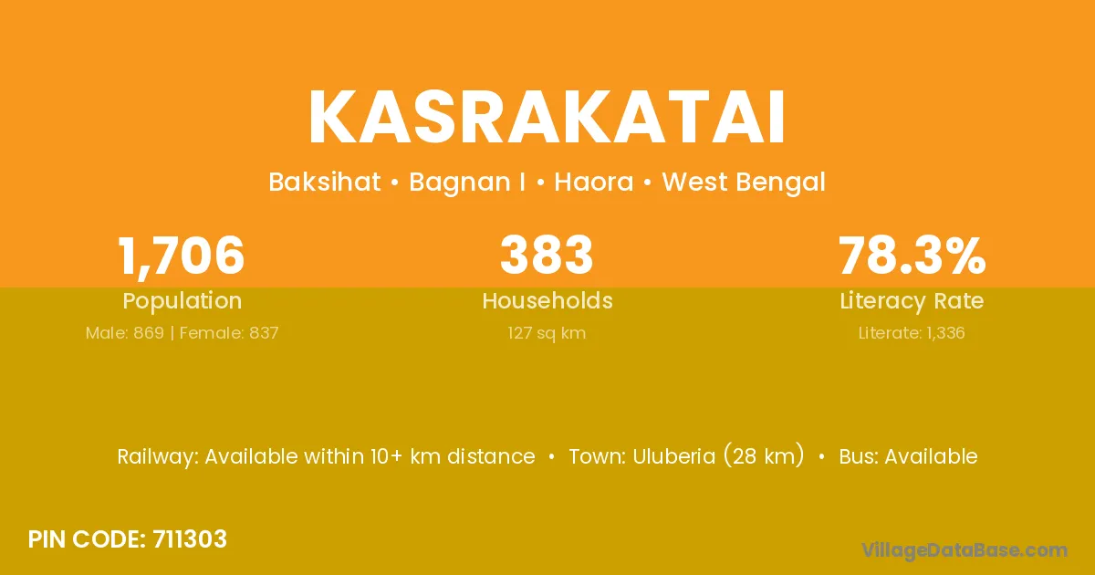 Uluberia (28 km) is the nearest town to Kasrakatai village for major economic activities and is located approximately 28 km away.