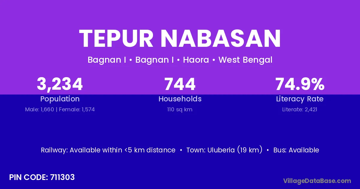 Uluberia (19 km) is the nearest town to Tepur Nabasan village for major economic activities and is located approximately 19 km away.