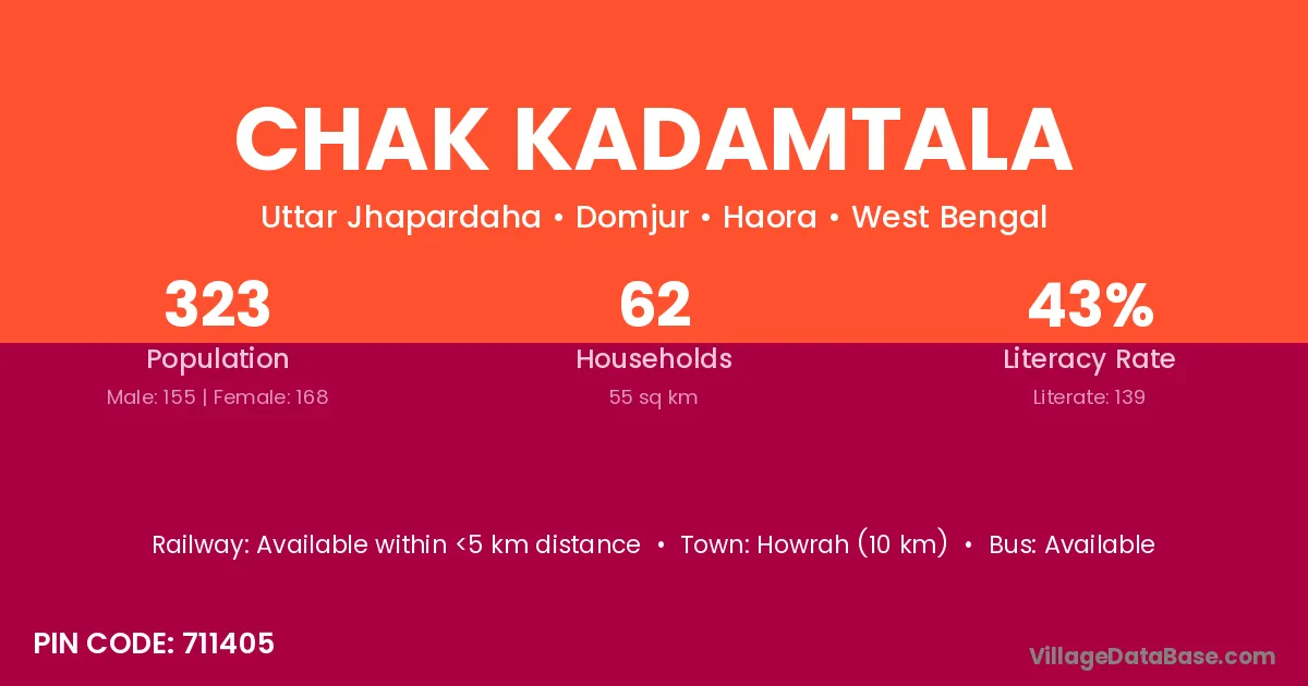 Howrah (10 km) is the nearest town to Chak Kadamtala village for major economic activities and is located approximately 10 km away.