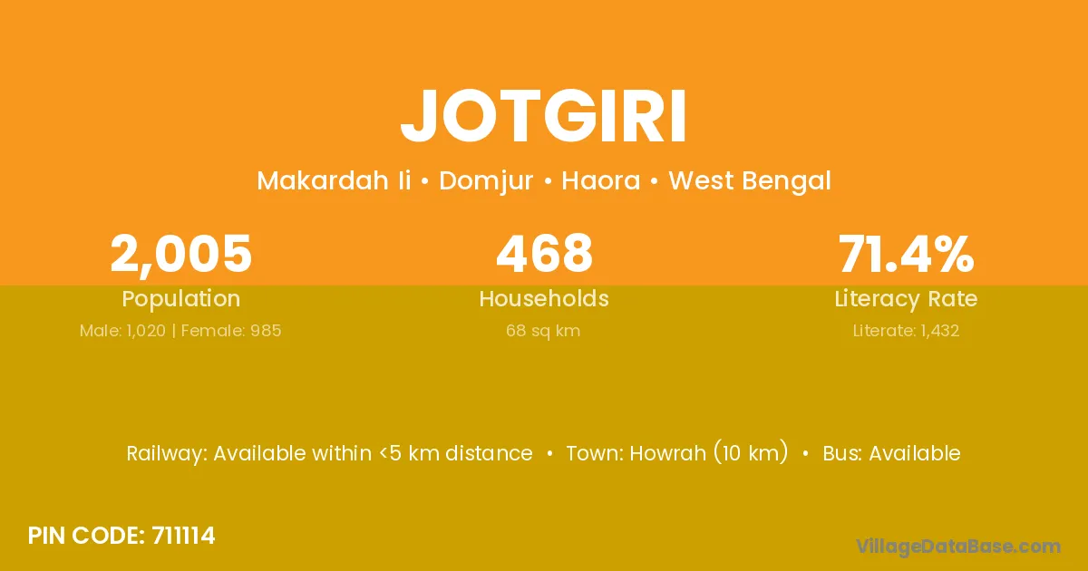 Howrah (10 km) is the nearest town to Jotgiri village for major economic activities and is located approximately 10 km away.