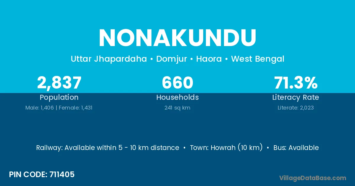 Howrah (10 km) is the nearest town to Nonakundu village for major economic activities and is located approximately 10 km away.