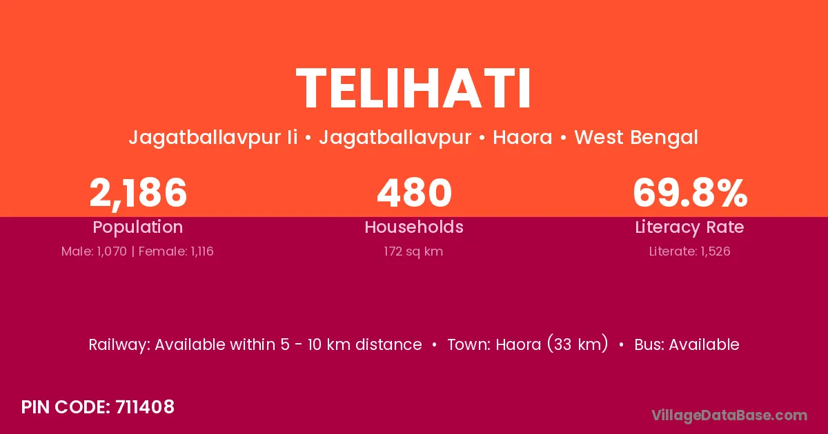 Haora (33 km) is the nearest town to Telihati village for major economic activities and is located approximately 33 km away.