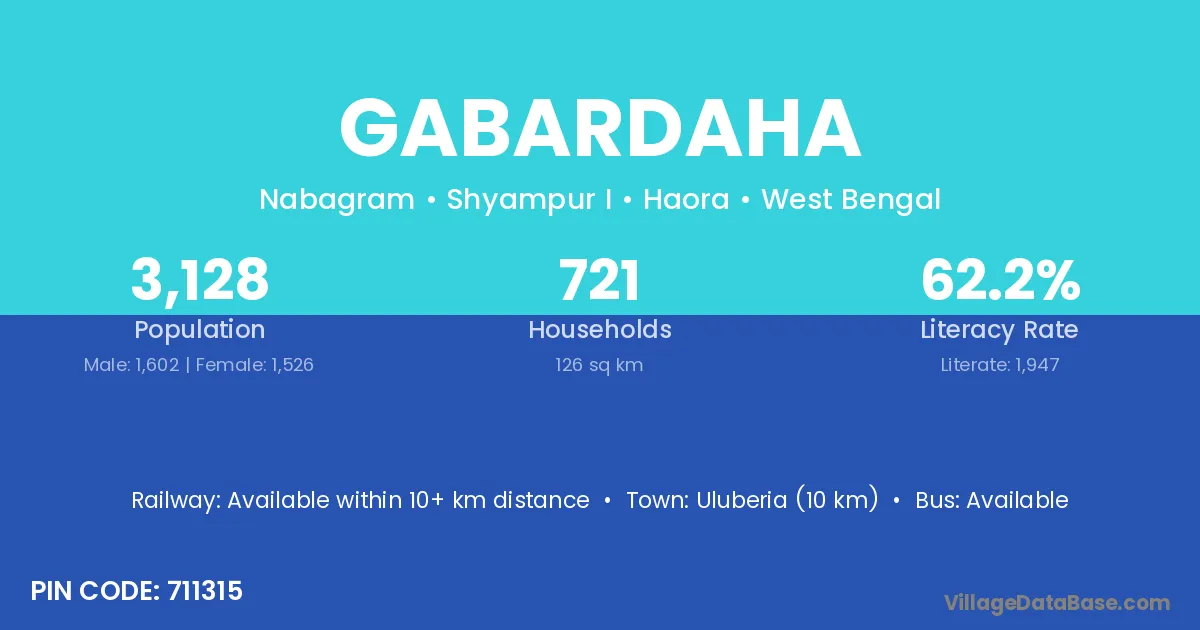 Uluberia (10 km) is the nearest town to Gabardaha village for major economic activities and is located approximately 10 km away.