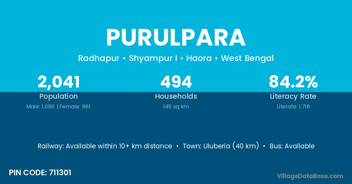 Uluberia (40 km) is the nearest town to Purulpara village for major economic activities and is located approximately 40 km away.