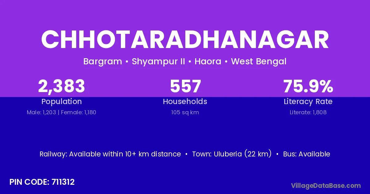 Uluberia (22 km) is the nearest town to Chhotaradhanagar village for major economic activities and is located approximately 22 km away.