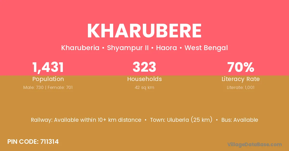 Uluberia (25 km) is the nearest town to Kharubere village for major economic activities and is located approximately 25 km away.