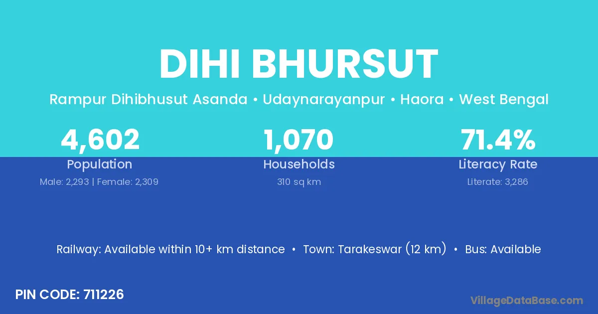 Tarakeswar (12 km) is the nearest town to Dihi Bhursut village for major economic activities and is located approximately 12 km away.