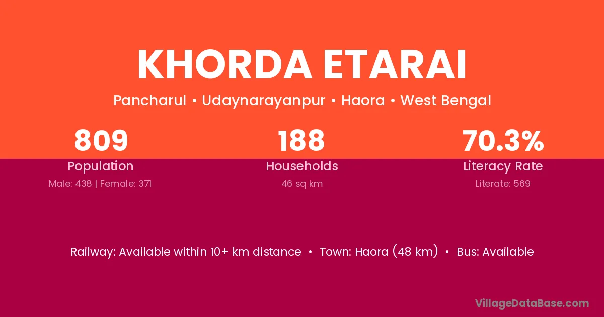 Haora (48 km) is the nearest town to Khorda Etarai village for major economic activities and is located approximately 48 km away.