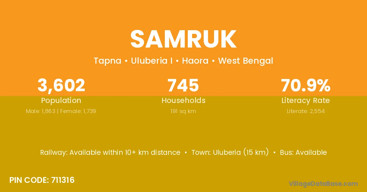 Uluberia (15 km) is the nearest town to Samruk village for major economic activities and is located approximately 15 km away.